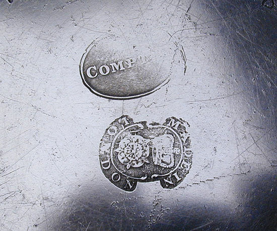 An Export single reed rim Export pewter plate by Townsend & Compton, London 1784-1802. This plate measures 7 11/16”. This plate has owner’s initials and a date of 1858 on the bottom of the plate. Interestingly, this plate was undoubtedly owned by the same family as a Love plate we recently had. The Love plate had the initials and date “BP BP 1858”. (see photo)