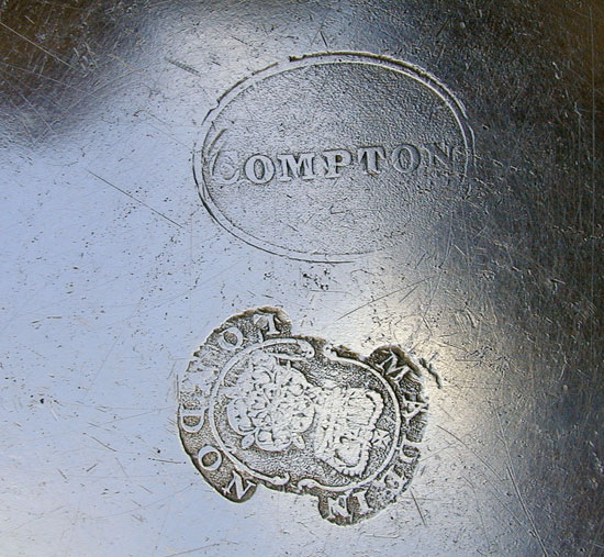 In the photo of the touchmarks with arrows, note how the edge of the"Made in London" mark is rough. This particular die was crumbling and it eventually lost a good deal of the wording at this point. Due to this deterioration you can judge if a Compton plate with this Made in London die is of early or later production. The more damage the later it is.