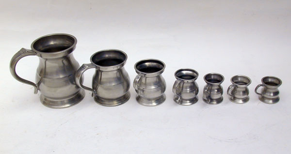 An assembled set from 1/28th to Pint bellied English Pewter Pub Measures. These were a common sight in English Pubs from the mid-19th century until the early 20th century. In fact some pubs still have a set displayed for decoration.