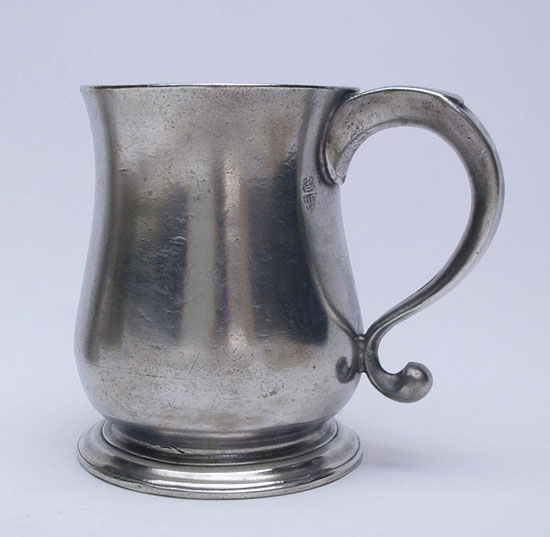 Pint Tulip Form Export Pewter Mug by John Townsend. This well-worn tulip mug was made by the firm of John Townsend of London, 1748-1801. It is marked with his small lamb and dove touch he used exclusively on hollowware.