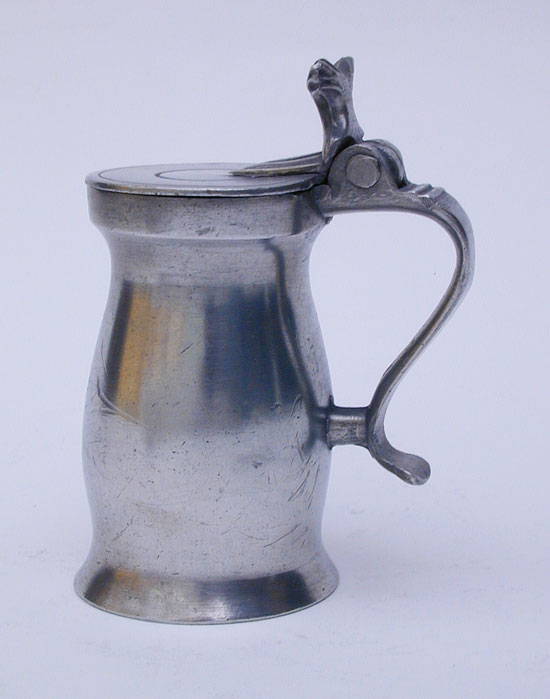 English Export Gill bud baluster pewter measure. This measure would likely date from 1725-60’s. It is marked with touch number 2517 on the Pewter Society Database. The touch is a thistle with the initials W and either an H or an N. This has not been assigned to a specific maker.
