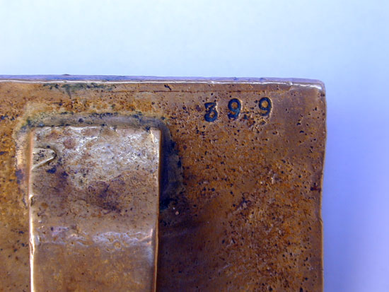 The decorated side of the buckle is curved outward.There is a "bench" number 399 stamped on the back edge near the tongue, which fit into the keeper on the belt. This example shows some genuine use and is in very good condition. Note the indents on the back by the tongue this shows this buckle was heavily used.
