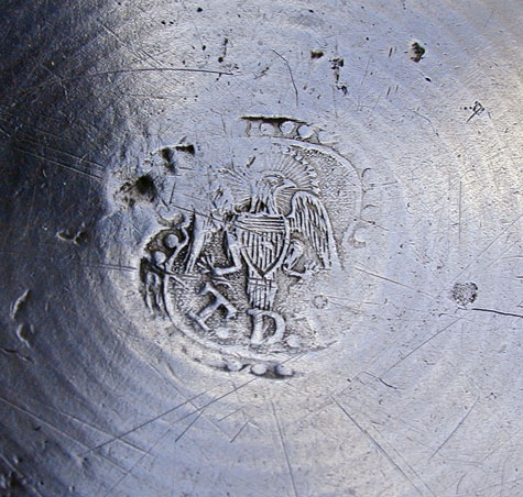 This basin is in very fine condition save for a very few pits on the inside of the bowl. The basin is marked with what is likely Thomas' first touchmark, a waisted beaded oval border with an eagle motif and his initials, TDB. This touch is patterned after his uncle Edward's beaded border lion touch.