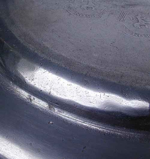 7 15/16” single reed rim plate by Thomas Danforth II with hammered bouge. Thomas Danforth II produced pewter in Middletown, Connecticut from 1755 until his untimely death in 1782, during his earlier years he produced sadware (flatware) with hammered booges. Plates and dishes by Thomas Danforth II with hammered booges are rarely found. This example is in very good condition with fine touches. It is important to note that over time his hallmarks received various damages. The hallmarks on this plate have only the first of these “mishaps” a slight nick in front of the leopard’s mouth (second hallmark).